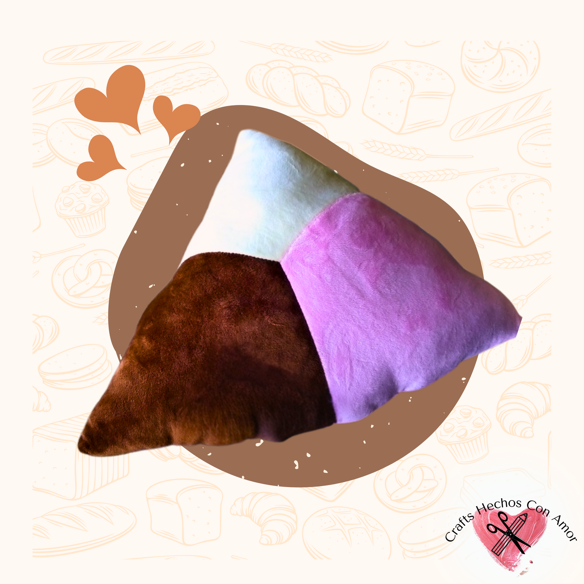 Cute "Payaso" (polvoron) plush cushion. Triangle shaped, in the classic neopolitan colors: strawberry, chocolate and vanilla. Sides are random length, between 12-15", with height about 13". They ship compressed to save space, but after fluffing they get about 5" or more in thickness. Another great cushion for your pan dulce collection! Original design by Xochico™.